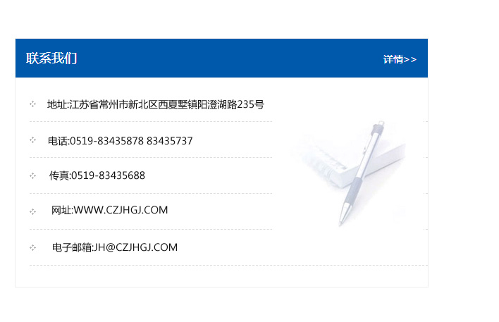 地址:常州市新北區友邦商務大廈1幢16、17層  電話:0519-85101652  傳真:0519-85112595  郵編:213022  網址:www.cz-jiayue_cn.sjshb.com  郵箱:xiajifengaa@163.com
